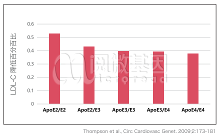 Thompson 2009年研究基因多态性对于他汀降脂疗效影响试验中指出,ApoE基因多态性与降脂疗效有显著相关,且降脂疗效依次为ApoE2/E2 >Apo E2/ E3> ApoE3/E3> ApoE3/E4> ApoE4/E4。
