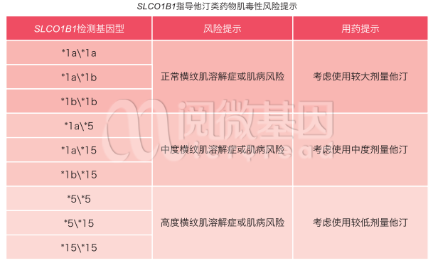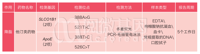 CPIC药物遗传学指南和国家卫计委颁布的《药物代谢酶和药物作用靶点基因检测技术指南(试行)》中指出:SLCO1B1和ApoE基因多态性影响他汀类药物的代谢水平,医生可根据其基因多态性,指导病人他汀类服用剂量,降低发生肌病的风险。