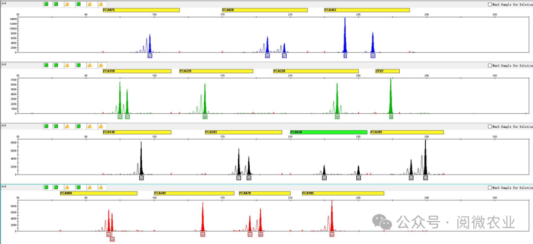 自 2014 年农业部联合各地重点农作物农科院、研究所、农林科学院等单位起草几个主要粮食作物的品种鉴定SSR 检测行业标准,根据该标准,盛煌娱乐之梦基因开发了检测作物SSR 的 panel。该 panel 采用荧光 PCR 扩增(Quantitive Fluorescent PCR,QF-PCR)结合毛细管电泳检测的方法,进行扩增片段产物大小的准确检测。