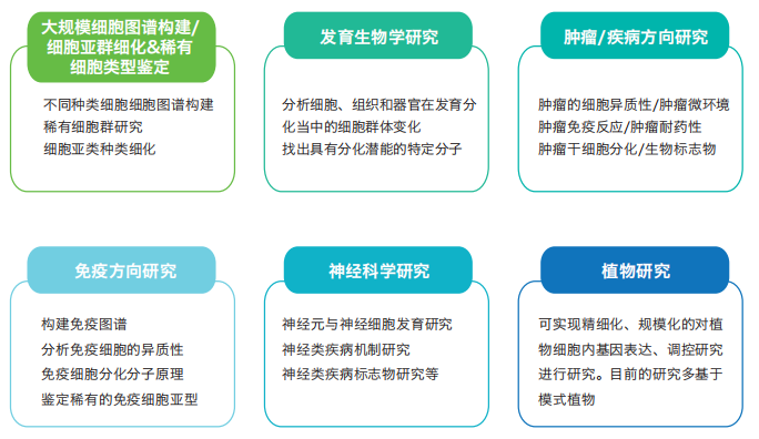 传统的高通量测序技术被广泛应用于研究不同组织/品种/处理/时间点等样本,但多是反映特定组织/细胞集合的基因表达平均水平或者代表性信息,单个细胞特异性的信息往往被掩盖,导致错失很多重要信息。10x Genomics Chromium系统利用微流控技术分选单个细胞后将细胞分配到油包水微反应体系中,并顺利获得每个微反应体系中含有的特定DNA标记序列(10x barcode和UMI )区分不同单细胞和转录本,可实现单细胞分辨率上的各类测序。其适用于多种细胞类型,包括生殖细胞、胚胎细胞、血细胞、神经细胞、肿瘤细胞、免疫细胞、干细胞等。